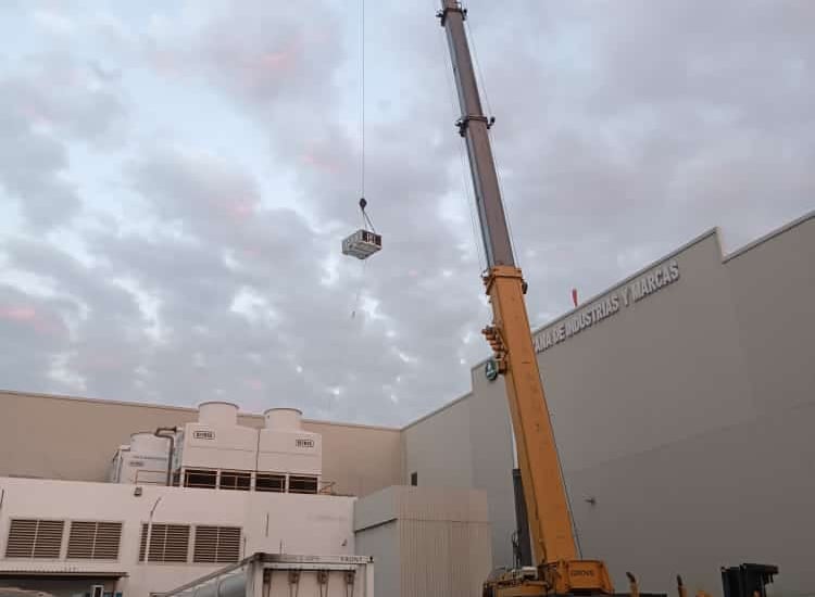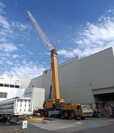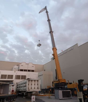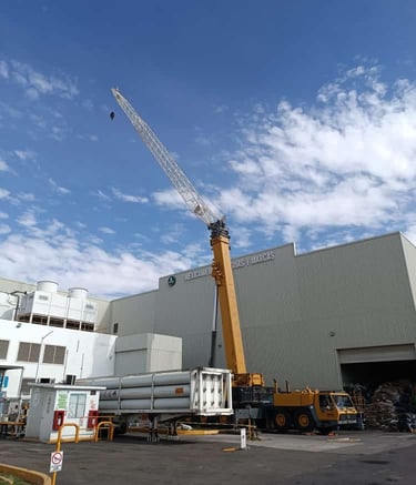 Realizamos el montaje de tanques sobre una estructura metálica en el techo superior de nave dentro del parque industrial, ejecutando la maniobra con precisión y seguridad.